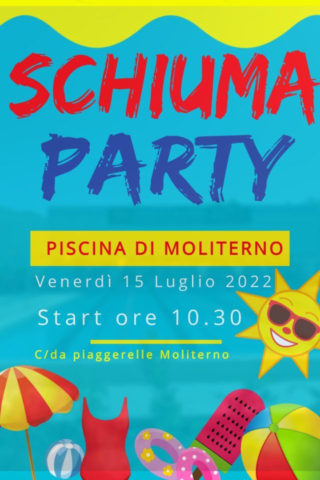 Luglio, 2022 SCHIUMA PARTY alla Piscina di Moliterno 15LugTutti i giorniSCHIUMA PARTY alla Piscina di Moliterno(Tutti i giorni: Venerdì) Dettaglio evento Dettaglio evento OrarioTutti i giorni (Venerdì) CalendarioGoogle Calendario